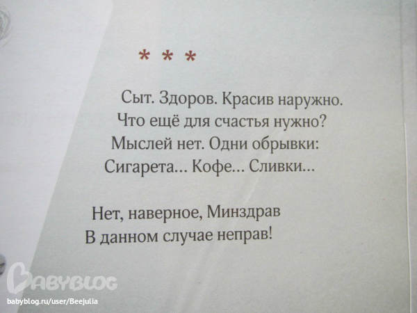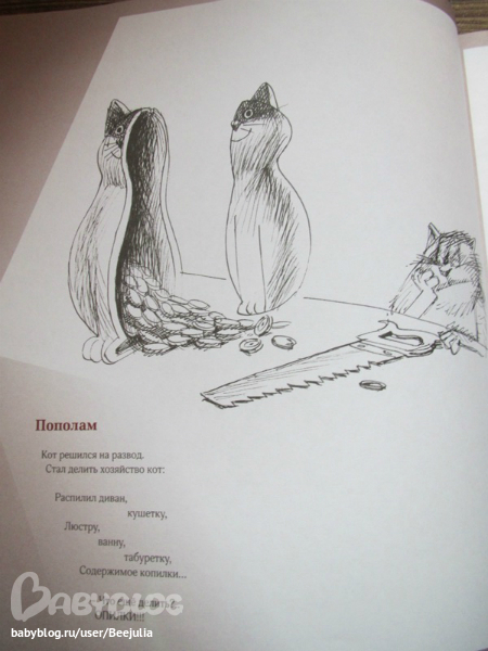 Полный, полный восторг!!!!!!!!! Читаем, складываемся от смеха пополам, ребенок веселиться с нами, НО! Стихи эти на мой взгляд для взрослых, что называется на злобу дня, они и про политику, и про отношения между мижчиной и женщиной, и про народ, и про социальное неравенство и многие другие животрепещущие темы.