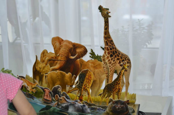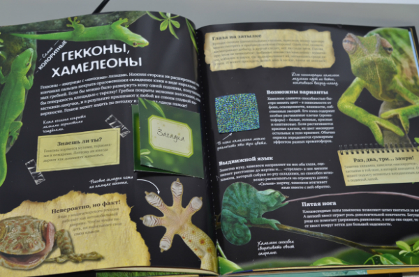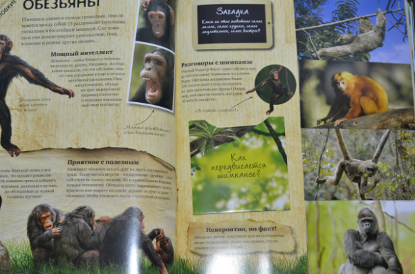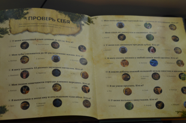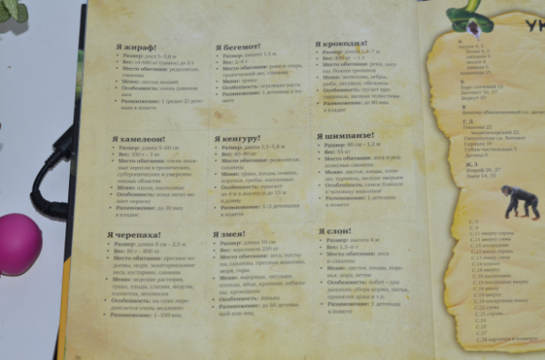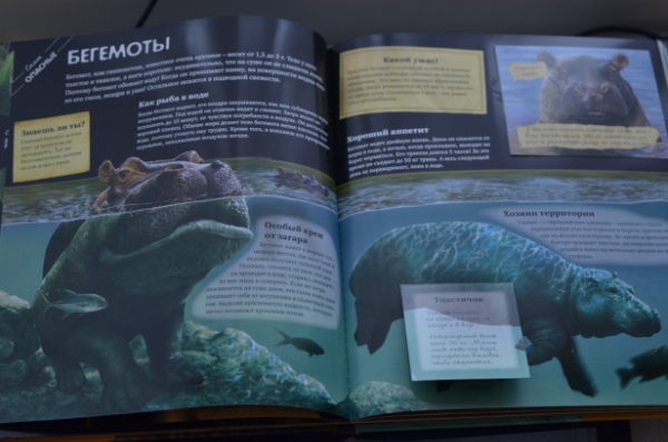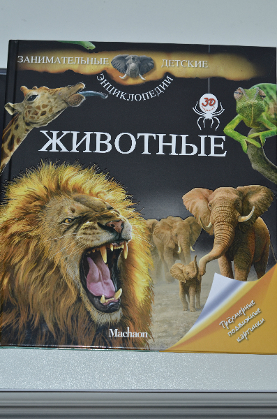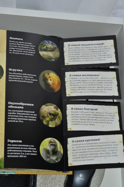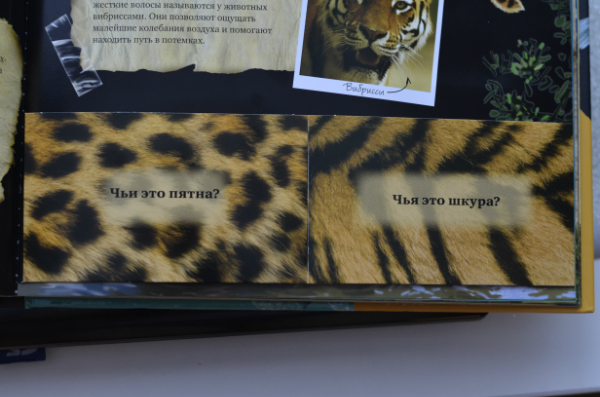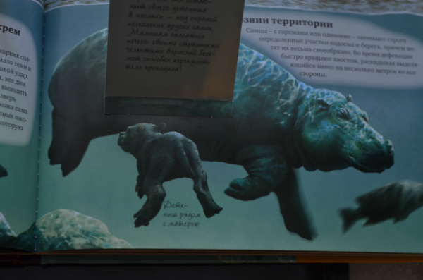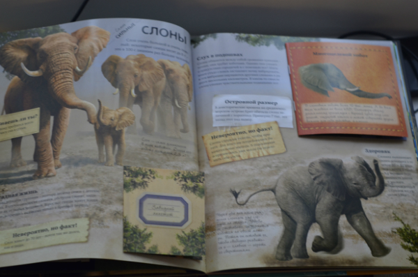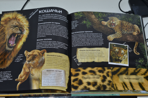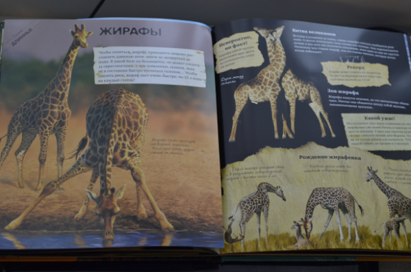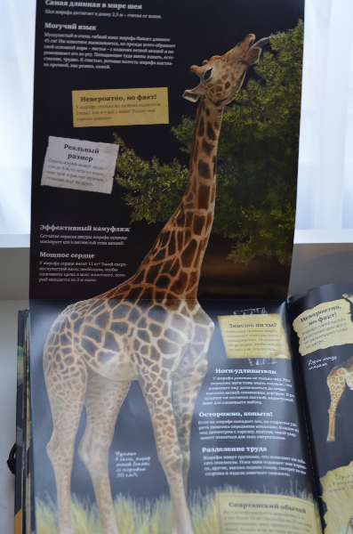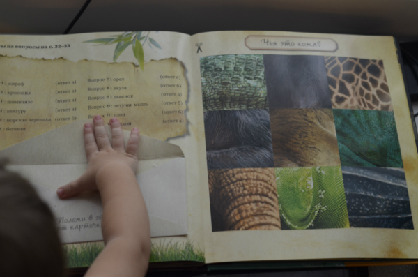 Сама книга чудесная, красивые, реальные, фотографические картинки, животные представлены в разных "образах", качество печати отличное, странички на мой взгляд не тонкие,текстовое наполнение прекрасно подходит для малышей:приведены факты, особенности обитания и жизни, рассказано о дитенышах, но самое главное на каждой страничке малыша ждут сюрпризы в виде открывающихся окон, кармашков с сюрпризами,загадками и даже тактильной вставкой. В конце книги приводятся факты о животных в цифрах, среда обитания, особенности питания и размножения.Также есть странички с вопросами для проверки знаний и объемная картинка группы африканских животных, которую моя малышка изучала долго и никак не хотела идти спать. О малышке: она с удовольствием рассматривает всех животных, слушает информацию, которую я зачитываю(читаю, конечно очень выборочно), по картинкам здорово изучать части тела животных и обсуждать, чем они занимаются. Могу сказать,что книга ей очень понравилась, потому что ни раз бывало такое, что я показываю и предлагаю почитать какую-то книгу, а она не хочет, здесь она готова ее рассматривать долго.