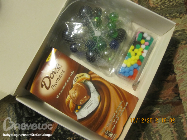 Невероятно красивые шарики - антидепрессанты (их из рук выпускать не хочется, и в голову сразу приходит масса вариантов их использования, мягкие шарики для детского творчества и вкуснейший шоколад Dove с предсказаниями. На мою просьбу (или вопрос?:), прибавят ли мне наконец зарплату, мой карманный предсказатель ответил, что все в моих руках:)
