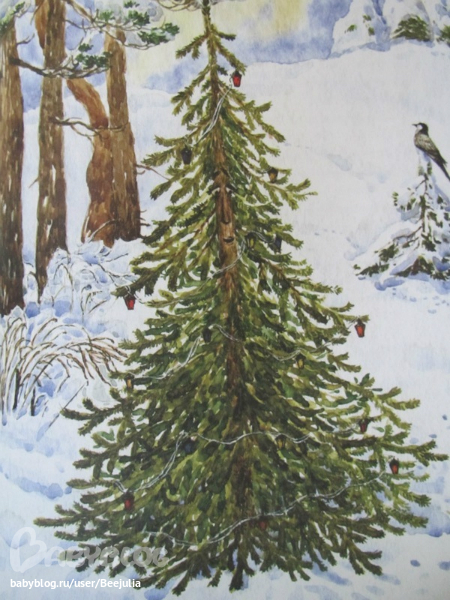 Стихотворение мне не понравилось, я бы его ребенку не читала! История такова: елочку нарядили дома, а она убежала, так как хочет вернуться к маме своей с которой ее разлучили и вот она к ней идет! Хэппи энд - елочка нашла свою маму! Но вот после такого стихотворения думаю ребенок не захочет чтобы у него была живая елка, так как будет думать, что ее разлучили с мамой! А вот иллюстрации самые что ни на есть потрясающие! Собственно ради них я и покупала эту книгу и решила что ей все - таки место в нашей библиотеке! Обожаю Ващинскую! Готова смотреть книги с ее иллюстрациями постоянно))))