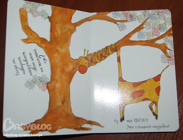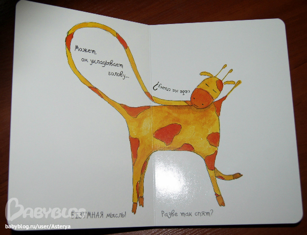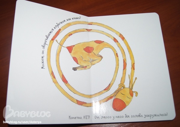 Скажу честно, поначалу на меня книга огромного впечатления не произвела) Да, симпатичная, забавная, но не более того... Но реакция дочки удивила! Она с удовольстием ее рассматривает, хихикает над жирафчиком и всячески выражает свою симпатию к этому милому животному) В общем, я еще раз убедилась, что книги "Поляндрии" имеют особое обаяние, не всегда понятное взрослым, но очень подкупающее детей.