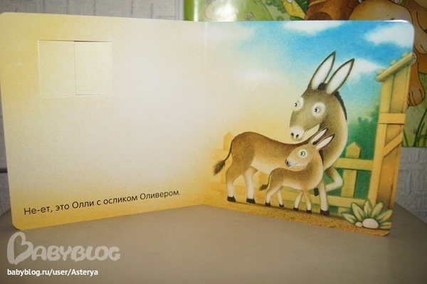 Книга ориентированна на малышей, всем им обычно нравятся книги с окошками и клапанами. Помимо этого здесь мы имеем хорошее исполнение, трогательную историю, приятные для глаза иллюстрации. Для маленьких деток - то, что надо, советую! Моя Ася в полном восторге)
