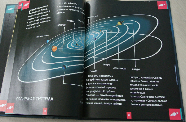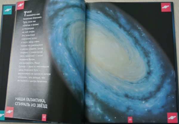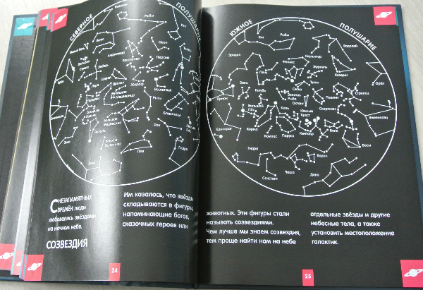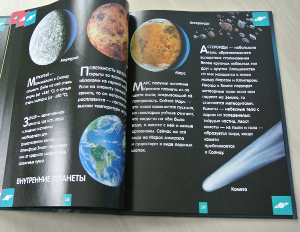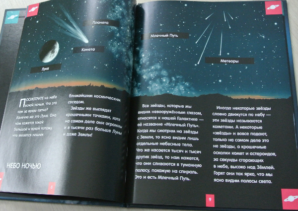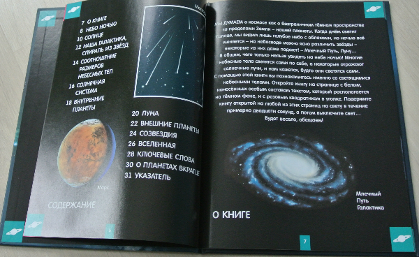 Уникальность книжки заключается в том (уж о космосе у нас много книг), что если разворот подержать немного на свету, то действительно светится в темноте. Читать - не читала в темноте. Я вообще считаю вредным читать с плохим освещением:))) А вот планеты, созвездия выглядят эффектно! Мальчишки половину Матюхиного дня рождения из ванны не вылезали, рассматривали книгу:)))) Ромка все норовился в школу взять и показать друзьям, как книга светится. Но я не понимаю, где он там темноту найдет... Хотя... он что угодно найдет, только как выбираться оттуда - заранее не подумает.:))) Вообщем пока книгу в школу не носил. Еще не хватало, чтобы сам там потерялся))