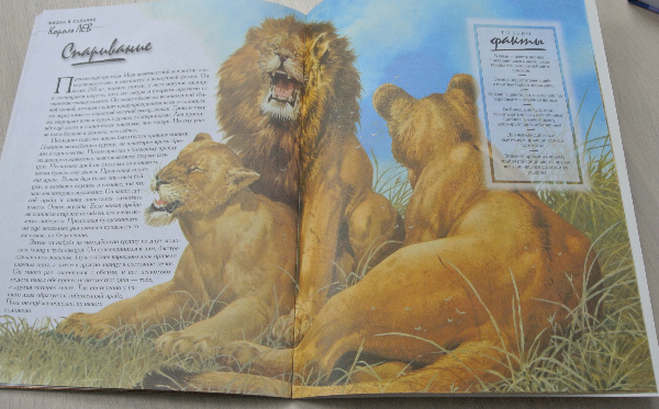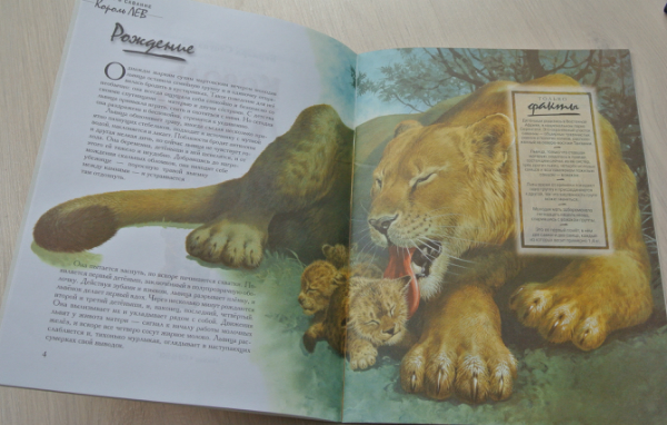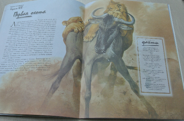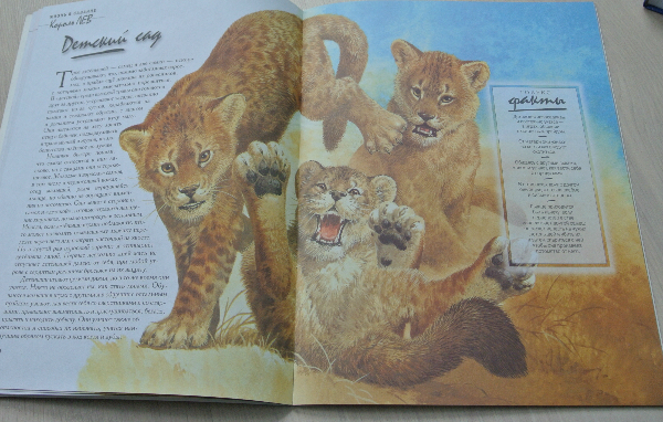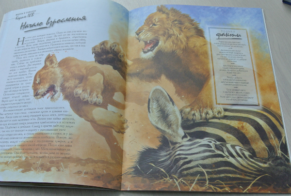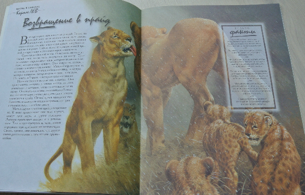 Хочу заметить, что изложение ооочень натуралистично. И все по взрослому: и про схватки (роды), и про смерть львят, спаривание... Поэтому когда читать это сврему ребенку - каждая мама посчитает сама нужным. А может и вообще отложит на самостоятельное чтение. (Мне кажется для самостоятельно чтения шрифт мелковат)