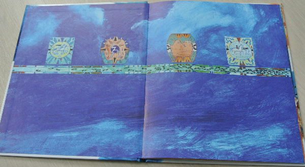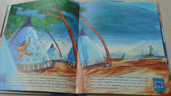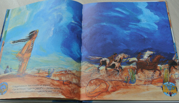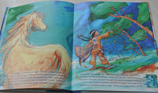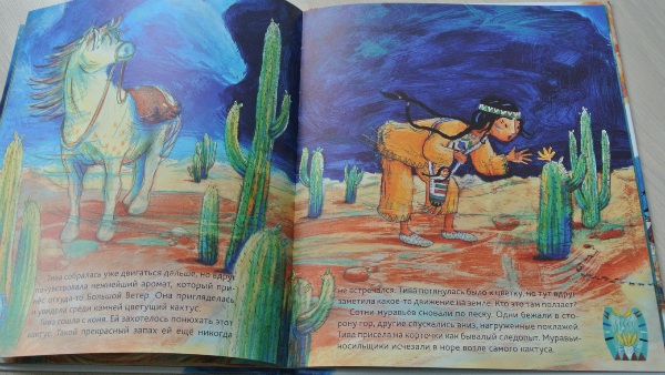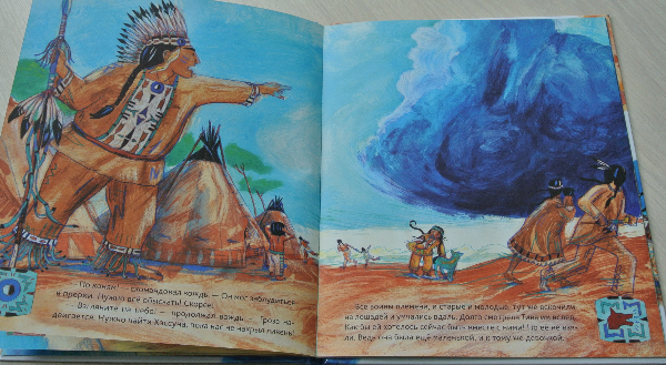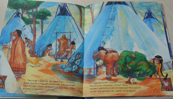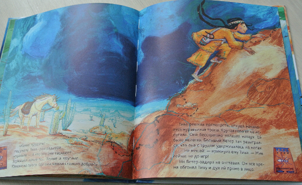 И однажды у главы племени пропал мальчик. По законам жанра именно Тива не без помощи друга нашла сына вожака. В общем-то, и весь сюжет книги-картинки:)))) Текст простенький, Рома читал-щелкал орешки. А вот развороты красивейшие! настолько самобытны, по-индейски яркие, сочные!
