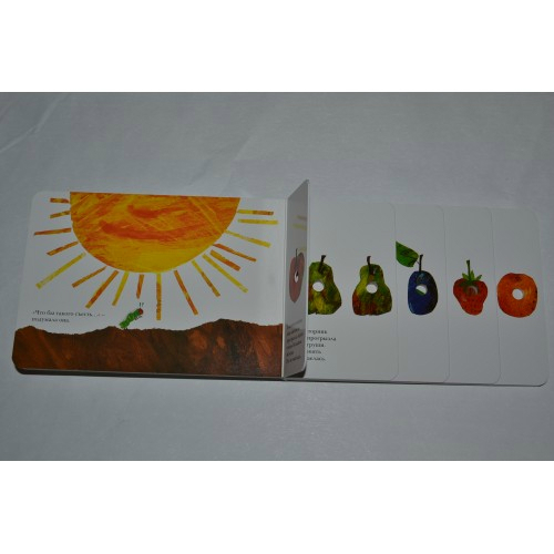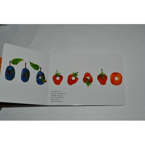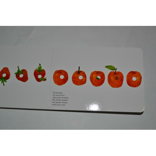 По этой книжке мой ребенок познакомился с фруктами (яблоко, груша, слива, клубника,апельсин), счетом от 1 до 5, днами недели. Выучил все продукты, которые сьела гусеница: пироженое, мороженое, соленый огурец, омтик сыра сдырками, кусочек колбаски, леденец, кусок вишневого пирога, сардельку, кекс и кусок арбуза.