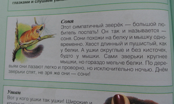 В наше время каждое уважающее себя издательство каждый месяц выдает по супер-пупер глянцевой книге. Чтобы яркая обложка, большущий формат книги, много кричащих и выразительных фотографий. Знаете, такие энциклопедии любят покупать на всю группу в сад или в класс в качестве подарков. Да, я согласна - попадаются и хорошие издания. А энциклопедии новые все выходят выходят, вытесняя предшествующих (как похоже на шоу-бизнес - певичек-однодневок пруд пруди, а Мадонна - она одна такая:))) ага, я ее поклонница еще со школьной скамьи )... К чему я веду: данная книга не из таких кричащих "купи меня. я дороХо-боХато выгляжу". Она скромненько отодвинулась ото всех со своими неброскими картинками. Но в этих неброских иллюстрациях столько нежности на мой взгляд. Пастельные оттенки всегда умиротворяюще действуют. Тем более когда нужно сделать небольшой доклад первоклашке в 6-10 предложений по какой-нить травке или птичке. А в этой энциклопедии как раз про каждую зверушку-травмнку можно прочесть немного. Но чем мне нравится это "немного" - написано в виде диалога с маленьким читателем. Как будто автор задает вопросы с целью поддержать разговор. И не надо из "много текста" выдергивать предложения и адаптировать для детского изложения.