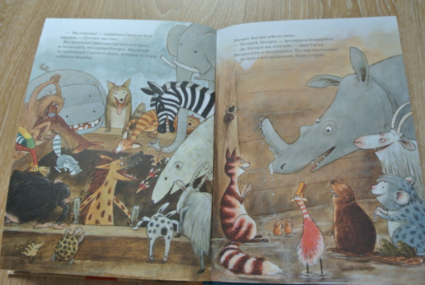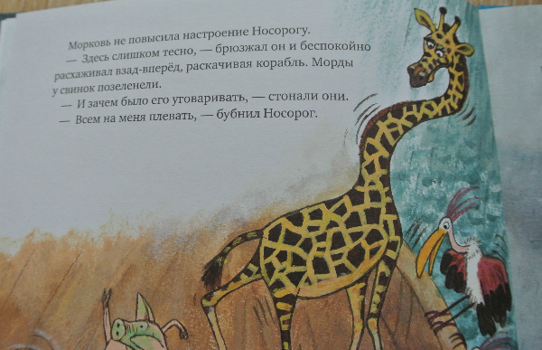 Показываю все развороты книги + начало текста покрупней. А главным героем истории окажется носорог, который всем недоволен. Да-да, носорог, который все бурчит и ворчит, всем мешает и недоволен ситуацией, в которой оказался. И если бы не дятел, которому захотелось постучать по трюму, и если бы не пингвин, который в спешке забыл хомуты и спасательные шлюпки, то потом был бы неминуем. А еще эти позеленевшие свинки... Морская болезнь, знаете ли:)). В общем, сплошной хаос. И дождь все идет и идет... Но сам того не желая носорог заткнул своим рогом пробоину и только начал опять возмущаться. как услышал, что его хвалят, им гордятся....
