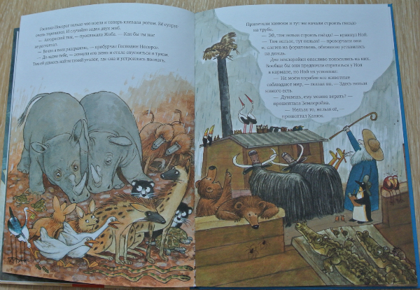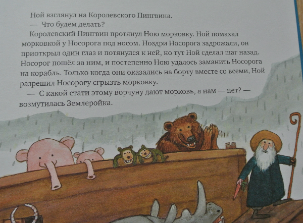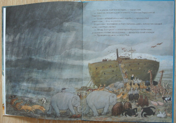 С Нурдквистом мы очень даже знакомы, его иллюстрации в нашем доме известны. Сама легенда (?) очень-очень пространственна в книге. Моим мальчишкам перед прочтением нужно будет объяснить, что согласно Библии праведник Ной по велению Бога призвал во время Потопа "каждой твари по паре" в построенный им ковчег. Чтобы вообще понимали, какова предыстория в книге. А книга начинается со слов "- Ну и дождь. Льет, как из ведра, - сказал Ной."