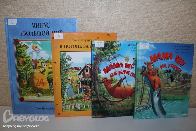 На прошлой неделе записала в библиотеку Софи (2,5 года), в соседнем доме. Как оказалось, там есть книги и для детей. Детский книгофонд недавно начала формироваться пару лет назад,довольно неплохой (есть, например, весь-весь Свен Нурдквист, и "Саша и Маша" Анни Шмидт ), две махонькие стойки пока. Вот мой улов 5 на дочкин абонемент, 5 на мой (жаль, что больше нельзя). Книги про муравья Фреду и про то,как Дед Мороз на свет появился нас будут ждать, надеюсь)))