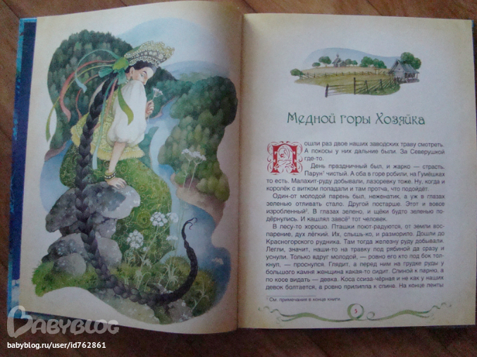 Ну вот наконец и Уральские сказы Бажова!!! Первое впечатление прекрасное!!! Книга удобного формата, не большая и не маленькая. Держать в руках и читать ребенку удобно. Как Вы видите на обложке вырубка, как бы окошко в удивительный мир сказок Бажова! А они на самом деле удивительны, неповторимы и необыкновенно интересны!!! Поэтому я очень долго думала и выбирала среди всех вариантов! И выбрала этот! Из-за иллюстраций О. Ионайтис! Они такие добрые в нужных местах смешные, красочные, я бы даже сказала сочные! Ням-ням)))) На фото они гораздо тусклее получаются. Поверте они прекрасны! И как раз подходят для первого знакомства ребенка с этим своеобразным и драгоценным, я бы сказала, писателем! Почему драгоценным? Потому, что в сказках часто упоминаются разноцветные, драгоценные камушки! В детстве я ими просто бредила))) Так хотелось тоже найти какой нибудь необычный камушек))) Помню, даже играли так, разбивали обычные камни, большими и смотрели какие они внутри. У кого попадался блестящий камушек, у кого узор необычный, все для нас казалось сказочным!)))