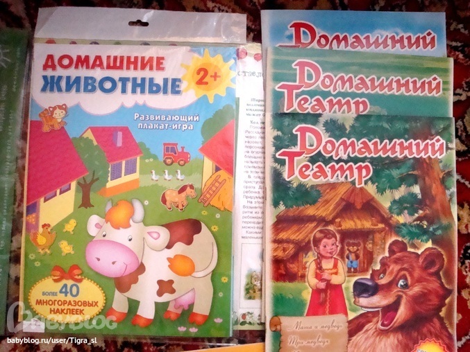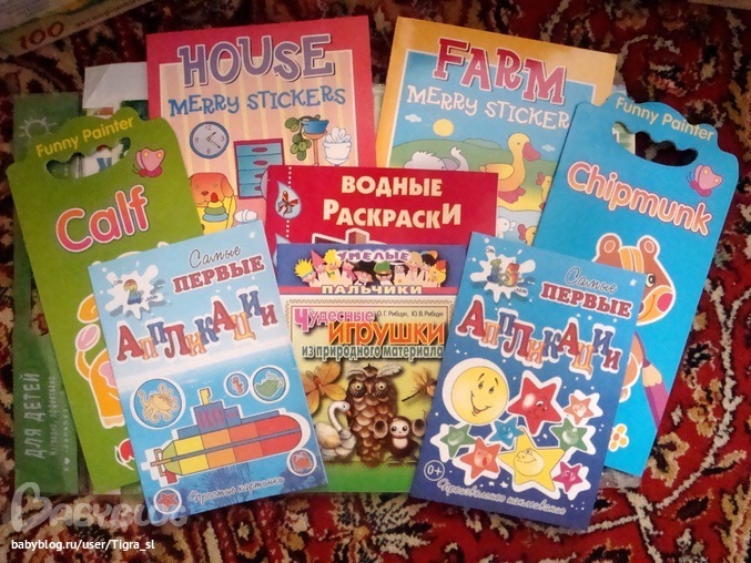 Это пособия изд-ва Ранок (кажется). Дом и Ферма - это немного странные пособия с одноразовыми наклейками и текстом на трех языках одновременно - английский, русский и украинский. С них мы начали знакомство с наклейками. Никакой худ. ценности не представляют, но впервые ребенок у меня просидел за одним занятием 40! минут и очень расстраивался, когда нельзя было отклеить обратно. Но я нашла выход - из самоклеющейся цветной бумаги нарезала фигурок и мы клеили их. Теперь буду искать многоразовые. Остальные книжицы ждут своего часа.