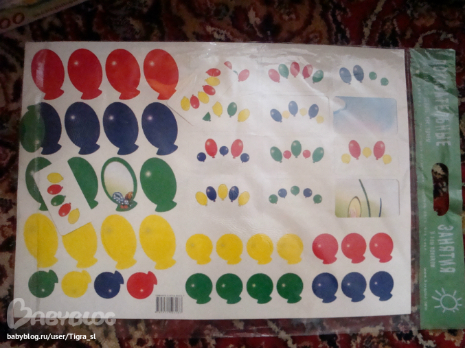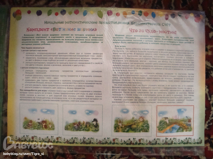 Вот такая шикарная огромина. Состоит из нескольких листов А3 формата. есть листы с раздаточным материалом (шарики, вот) с перфорацией. При необходимости можно разрезат и по одному шарику. И несколко игровых полей (4 шт, как на инструкции). Очень плотная бумага и приятные изображения. Миллион игр можно придумать от изучения счета-цвета до ситуативных сценок.