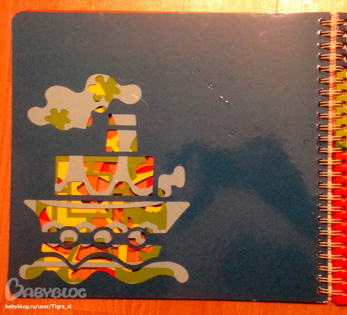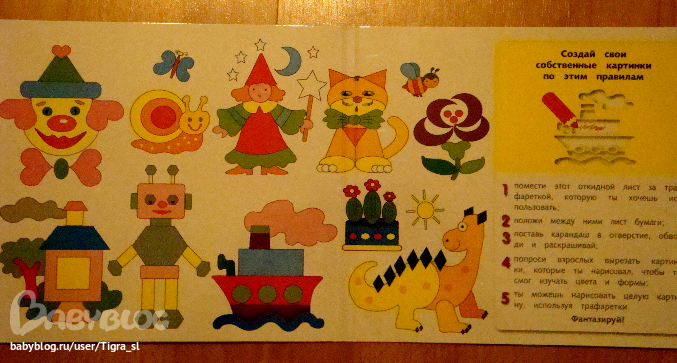 Книга с трафаретами. Несмотря на наш юный возраст, очень Василию понравилось рисовать по ним. Точнее вначале он просто играл с дырками. Потом сообразил, что эти дырки составляют фигуры. Теперь понял принцип раскрашивания и наслаждается на всех доступных (разрешаемых мною) поверхностях.