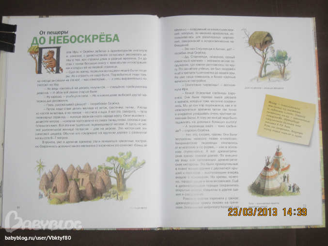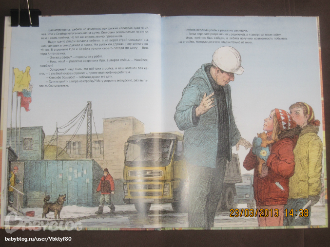 Брат и сестра узнают от отца радостную новость о том, что скоро переедут в новую квартиру, а дом в который они въедут строят неподалеку. Дети,прихватив кота, идут на прогулку и попадают на стройплощадку (туда убежал их котенок). Там они знакомятся со строителем, который предлагает ребятам экскурсию по стройплощадке (с разрешения родителей,конечно)). Это присказка. А дальше идет основная информация. Небольшой экскурс в историю, где рассказывается о домах, в которых жили наши предки. Есть главы про архитектурные стили, про строительные материалы. И основные главы о том, как же строятся современные дома. Дана краткая информация о подготовительных этапах строительства, описание строительной техники, расписанны основные этапы строительства и т.д. Вся информация изложенна понятным языком, без сложных терминов и словооборотов. Мы с моей шестилеткой уже немного почитали, слушает внимательно, вроде нравится. Мальчишкам, вероятно, будет намного интереснее.