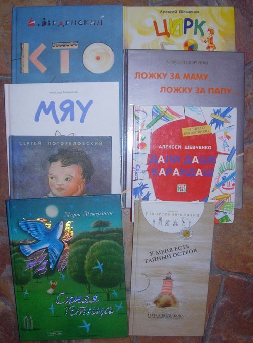 Шевченко - у нас дома его 4 книги, кроме трех показанных еще - Что творится в голове. Все прочитаны полностью, меньше всего зацепил Цирк. Да, книга смотрится отлично из-за иллюстраций, а вот стихи как то не очень, остальные три книги намного больше нравятся. Ложку за маму, ложку за папу - для самых маленьких, но дочка пробует читать сама. Дали даше карандаш и Что творится в голове - очень долгоиграющие книги, учитывая игры со словами, лет до 6-7 точно хорошо будет читаться!