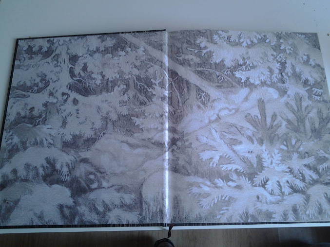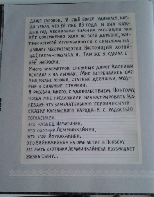 Книга большая, тяжелая. Обложка рельефная, структурированная под дерево, со стилизованным оленем, ляссе в наличии. Также в книге есть "письмо юному читателю" от художника, в котором Кочергин рассказывает о том, как были созданы образы его любимых героев "Калевалы".