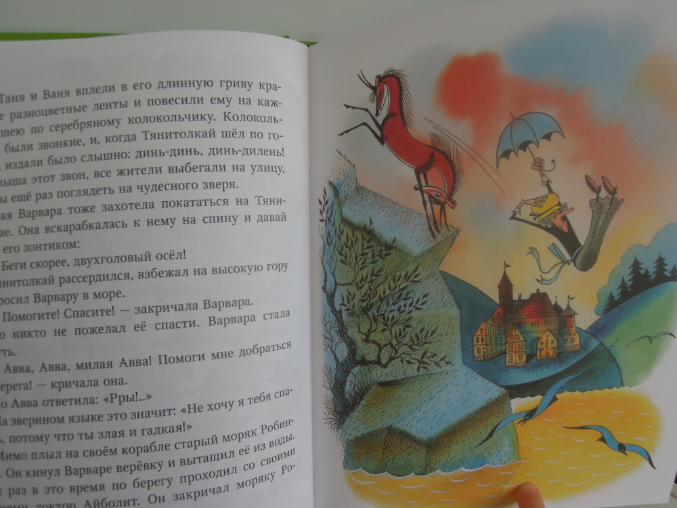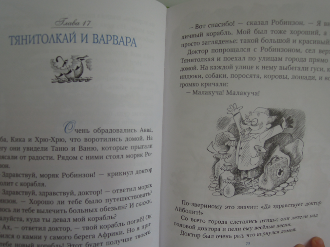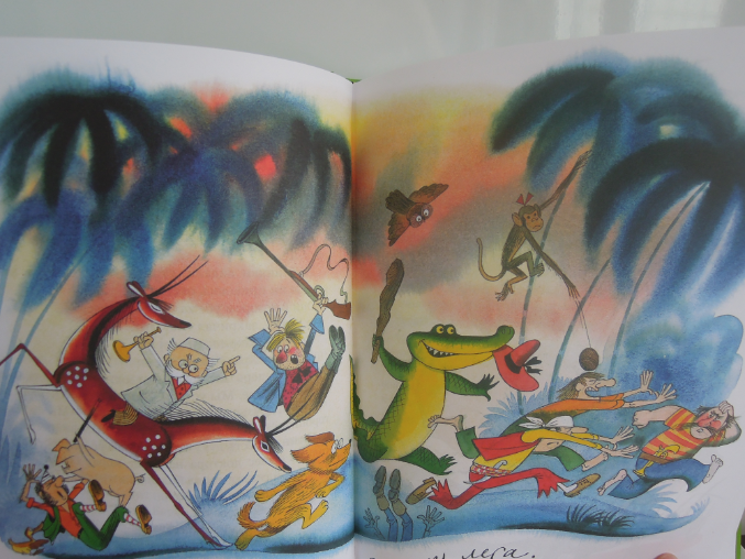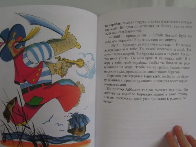 Мне очень понравился сам текст. Очень динамичные приключения, все время что-то происходит, меняется, держит ребенка в напряжении и подогревает интерес. При этом приключения простые, понятные трехлетке - вылечить больных, спасти мальчика, найти папу, убежать от пиратов. А еще, чувствуется, что Чуковский - мастер детского слова. Язык книги очень адаптирован к детскому восприятию. Много повторов, развернутые ответы, повторяющие частично вопрос, простые, понятные слова - все, чтобы ребенку было понятно, чтобы ребенок запомнил и следил за сюжетом без лишних сложностей. Никаких обзывательств, которые сплошь и рядом встречаются мне во вроде бы хороших детскийх книгах последнее время.