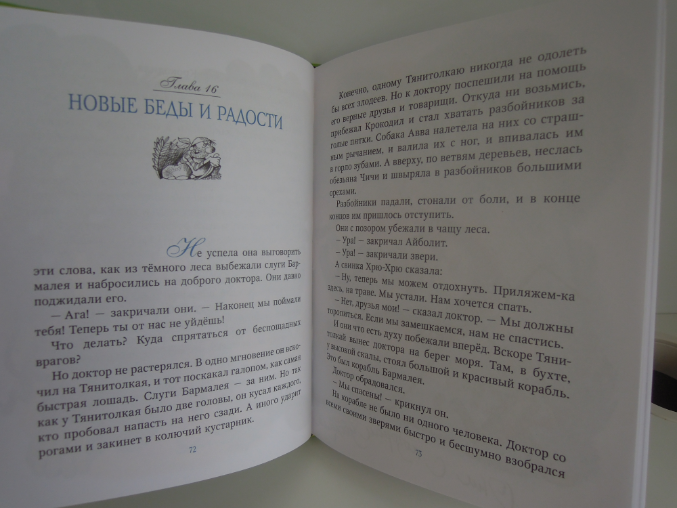 Ну и собственно, наши впечатления о книге. Когда берешь ее в руки, кажется, ну очень толстая для трехлетки, слишком много текста, не осилим, не будет слушать. Открываешь, начинаешь читать, и понимаешь, что рядом застыл ребенок, аж не шевелится. Нике на самом деле интересно. Она смеется там, где смешно, переживает там, где страшно, пересказывает сюжет недавно прочитанного и вспоминает всю историю в разговорах на следующий день. Особенно ей понравилась идея про звериный язык. Тут же подхватила, начала придумывать свои абракадабры, переводит сама на "людиный", как она говорит, язык. А меня эти куски со звериным языком немного раздражают. Кажется, ну зачем они тут, написал бы Чуковский сразу по-нормальному... Вот такой у нас диссонанс.