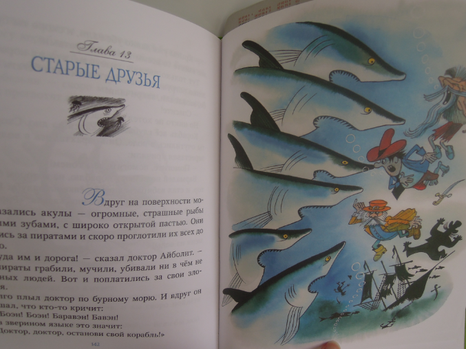 Еще позабавило, что Айболит в прозе - как будто следующий уровень. В сказках Чуковского в стихах плохие герои всегда исправляются и становятся хорошими. Тут уже такого нет. Злую Варвару Тянитолкай выбрасывает на необитаемый остров (илл. выше), пиратов съедают акулы (илл. ниже), и даже зацепившегося за канат Бармалея, кричащего "Помогите!", герои не спасли, а облаяли до потери пульса, так что он отвалился от каната и потонул. И никаких угрызений совести. все четко и ясно - они были плохие, всех мучали, и поэтому их съели. Никакого второго шанса.