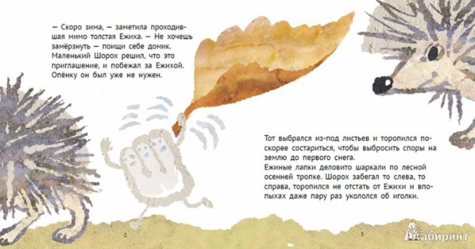Маленький Шорох родился в лесу осенью, вместе с поздним лесным Опёнком. Изо всех сил Шорох помогал Опёнку расти, тихо шурша опавшими листиками. Но однажды мимо Шороха пробегала Ежиха. «Скоро зима, — заметила она. — Не хочешь замёрзнуть — поищи себе домик». Как же Шорох теперь перезимует? Сам построить домик он не сможет, а друзей у него совсем нет…