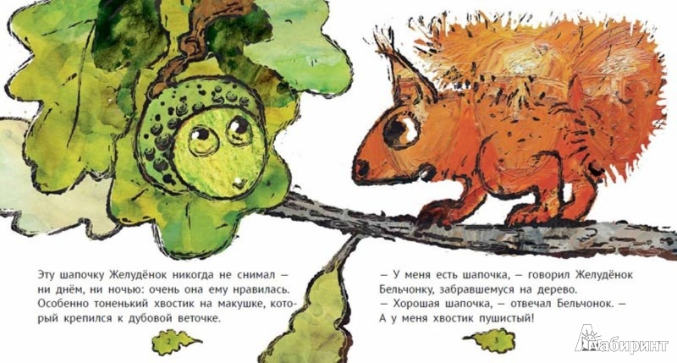 От издательства: На большом дубе, среди могучих ветвей и кудрявых листьев, жил-был Жёлудь. Не Жёлудь даже, а Желудёнок — такой он был маленький и зелёный. И была у Желудёнка шапочка, такая же маленькая и зелёная, как он сам. Эту шапочку Желудёнок никогда не снимал — ни днём, ни ночью: очень она ему нравилась. Особенно тоненький хвостик на макушке, который крепился к дубовой веточке…