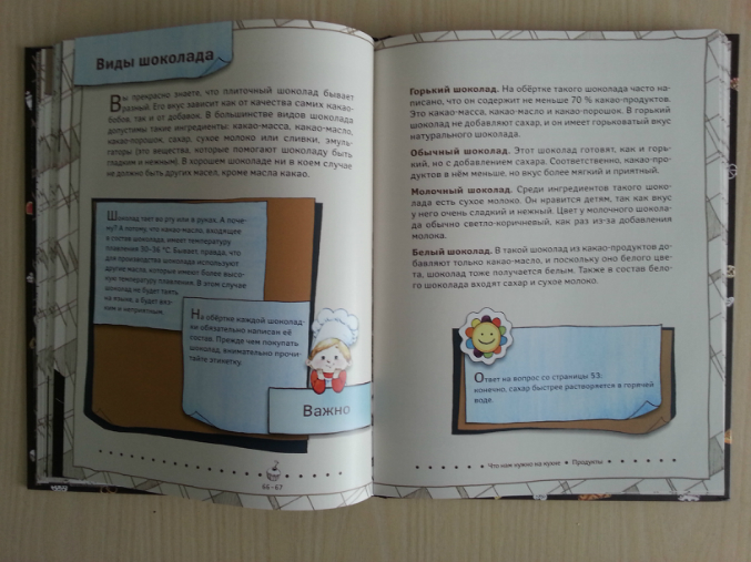 Почему сразу на кулинарыне книги ставят клеймо "Для девочек". В ней мне кажется достаточно интереной информации и для мальчиков: как делают муку и сахар, какие виды шоколада бывают и прочее. И девочки, мы наверное забыли, что больше всего шеф-поваров это мужчины. Поэтому, я для себя не списываю эту книгу со счетов, у меня сын любит мне помогать, что-нибудь смешать, помесить и прочее.