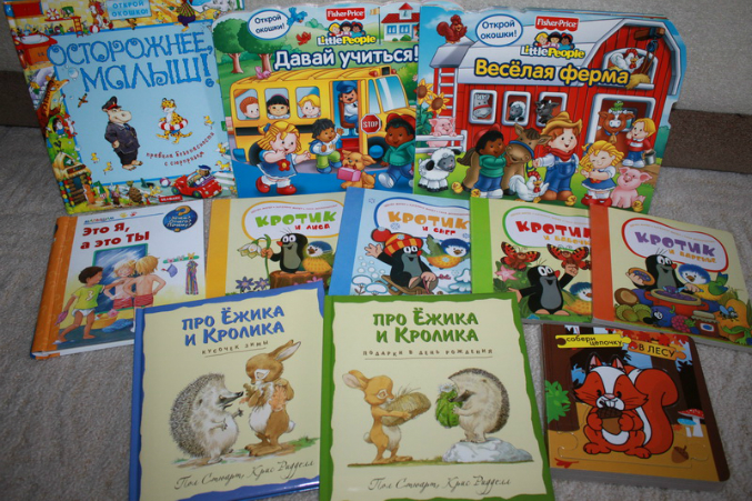 Книжки про Кротика - сначала хотела купить "Большие книги", но и они не исчерпывающие, лишь по 3-4 рассказа, поэтому решила начать с картонок, текста мало, зато поразглядывать можно.