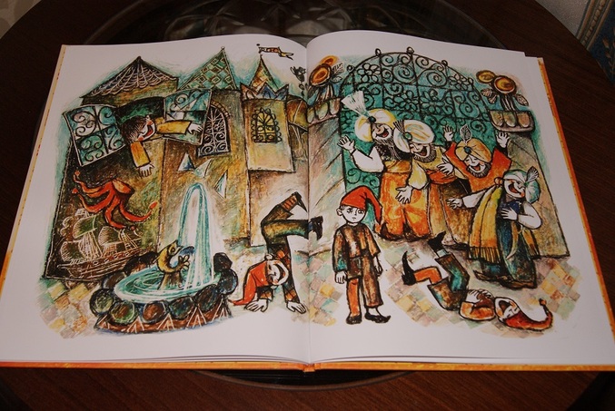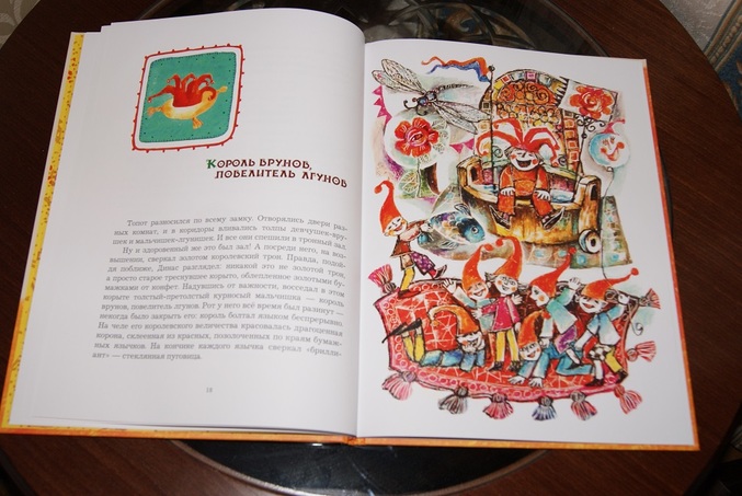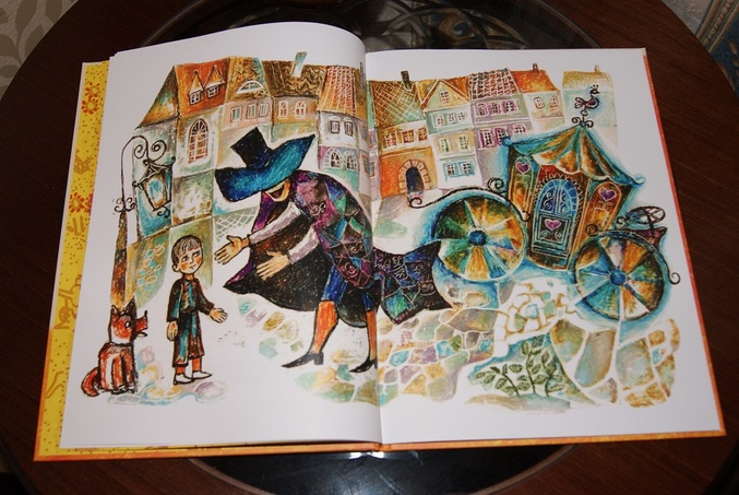 Книга большая, формат А4. Странички мелованные, крупный шрифт с буквой Ё. Иллюстрации мне очень понравились, необычные и напоминают витражи.