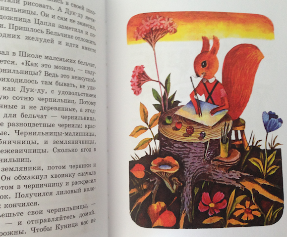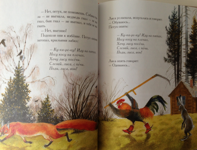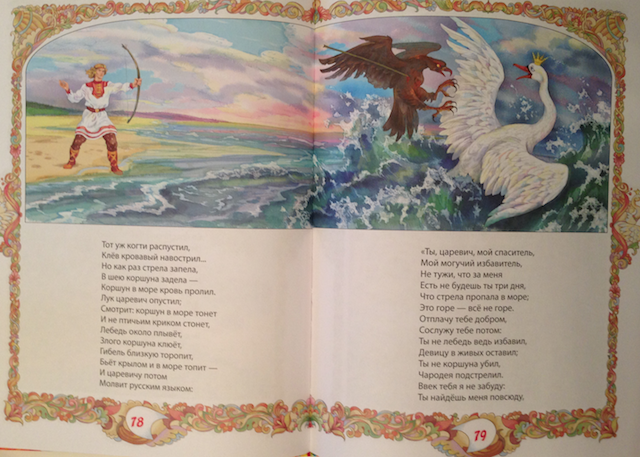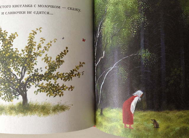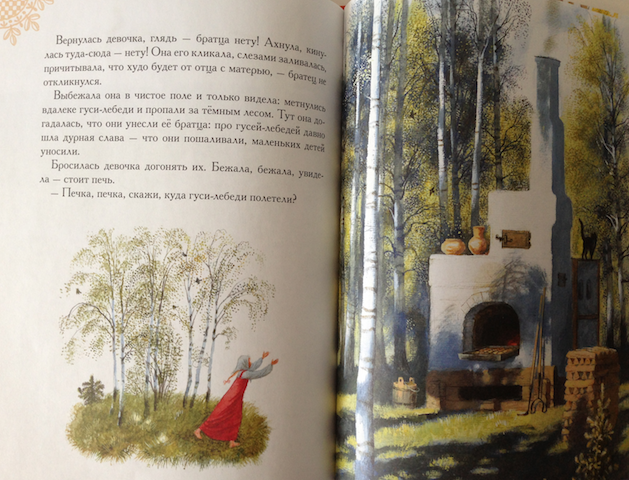 Читали все сказки кроме «Царевны-лягушки». Ребенок слушал с удовольствием и рассматривал картинки. Я думаю, что мы ещё долго будем наслаждаться прочтением этой книги. Не понравилось, что часто текст не совпадает с иллюстрациями, — приходится не читать, а рассказывать по картинкам. Еще большой недочет есть в сказке «Гуси-лебеди»: текст там в обработке А. Н. Толстого, а иллюстрации по А. Н. Афанасьеву. По иллюстрации сестрице помогает найти брата ёжик, но по тексту она находит его сама. По иллюстрации она уносит братца в обход Бабы Яги, а по тексту братец сидит на лавочке в избе, Баба Яга заставила девочку прясть кудель, а сбежать им помогает мышка.
