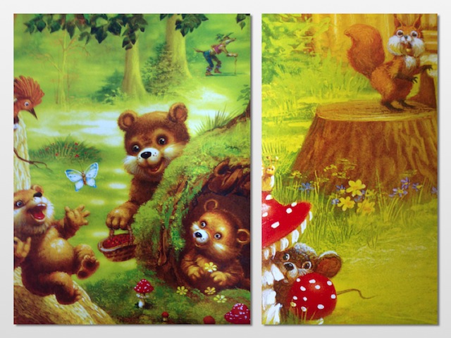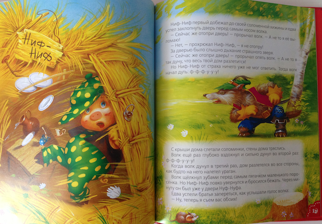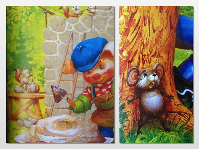 Сначала меня насторожила обложка. Очень уж она наляпистая, золотое теснение в виде снежинок, а у поросят по три пятна на щечках, то ли веснушки, то ли родимые пятна. Но, открыв книгу, я ахнула, — такие красивые иллюстрации там оказались внутри! Очень оживленный сказочный лес, насыщеные краски, волк ну прям такой разбойник, много милых зверушек: вот мышка боится волка, вот ежики всей семьей гуляют по лесу, мишки с малиной, а белочки и муравьи вообще поросенку помогают дом строить!