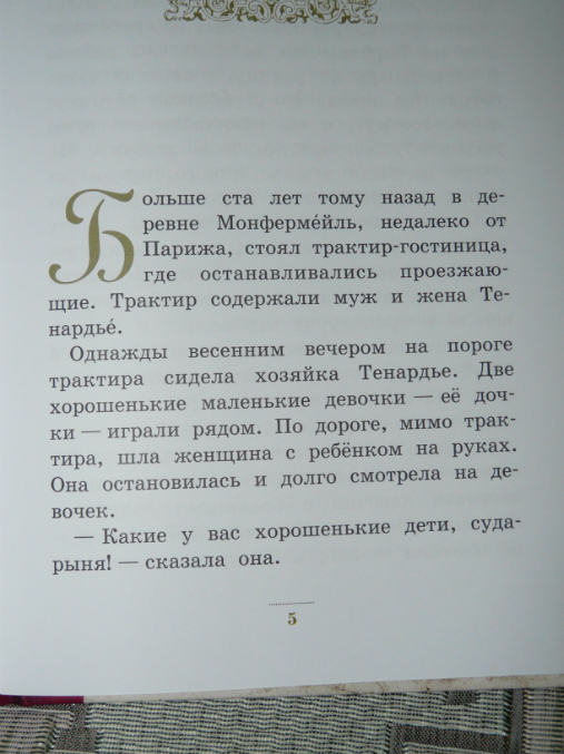 Моя любимейшая книга детства была утеряна, как я рада, что выпустили альтернативу. У меня остались самые теплые воспоминания об этой книге. В начале, мне ее читали, потом читала ее сама и не раз. Долго она ходила в моих любимицах. Взяла ее, скорее для себя, все-таки детские воспоминания глубоки :-). Но надеюсь, прочесть ее и своему ребенку и он хотя бы частично сможет увидеть, что жизнь бывает разной и не ко всем она благосклонна, но всегда остается надежда. Вот именно это хорошо в книге. И жизнь показана с нелицеприятной стороны и в то же время у ребенка не остается ощущения безысходности. Прекрасный отрывок из великолепного произведения Гюго "Отверженные.". РЕКОМЕНДУЮ! Особенно у кого девочки.