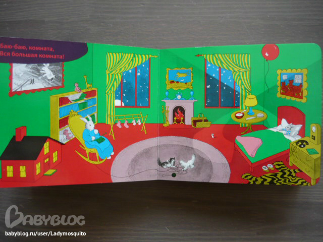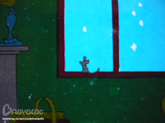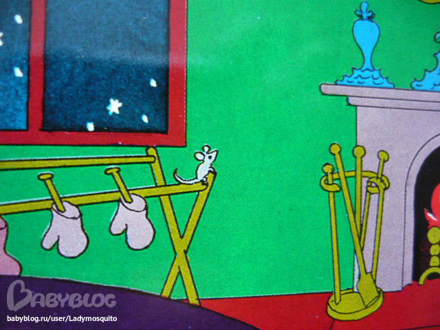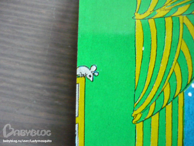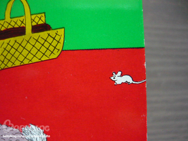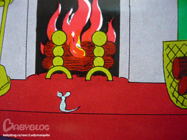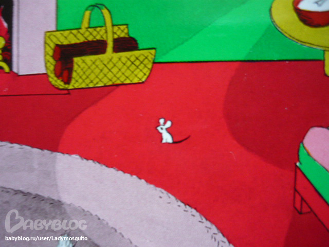 Кстати, Лев эту книгу требовал читать раз по двадцать, ооо, как он обожает страницу с бабушкой и всегда говорит: "Тсссс...." уже перед перелистыванием. Жду не дождусь, когда Лев начнет называть шарик летучим фонариком) Как это делает наш двухлетний друг) А мышка! Мышка любопытная, которую еще надо найти. Дозрел Лев до поисков мышки не сразу, а где-то через пол года после появления у нас книги. Она была уже читана-перечитана, всегда лежала под подушкой (благо, качество книги позволяет ее хранить в кровати - картон пуленепробиваемый), и вдруг Лев нашел книге новое применение - она стала у нас первой "искалкой") Кстати, мышку найти не так то просто, вот она, хитрюга: