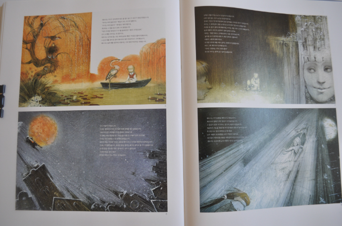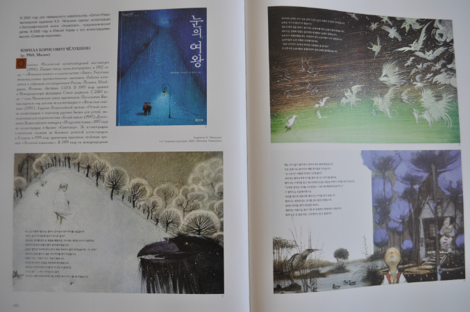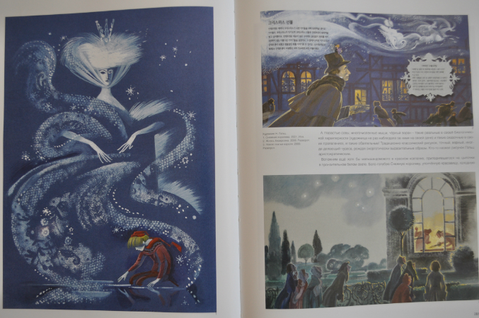 "Снежна королева" Кирилла Чёлушкина стала для меня открытием. "К Снежной королеве для южнокорейского издательства Чёлушкин исполнил двадцать разворотов, дав неординарную, как всегда, трактовку сказки. Так, Снежная королева - воплощение красоты и благородства. К Герде отношение же весьма снисходительное. Б.А. Диодоров пишет: "Буйство фантазии и красота. В целом и частном. Чёлушкин совершенно по-новому прочел "Снежную королеву". Влюбленно, как он сам скажет. Он даже в полемике с Андерсеном".