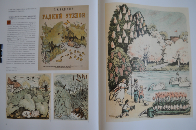 "В иллюстрациях к "Гадкому утенку" художница стремится обрадовать, заворожить и одновременно озадачить и удивить маленького читателя и зрителя. Сафонова строит книгу как сказочный спектакль со своей кульминацией и неожиданными сюрпризами. Иллюстрации выполнены в технике цветной литографии."
