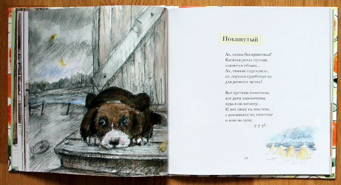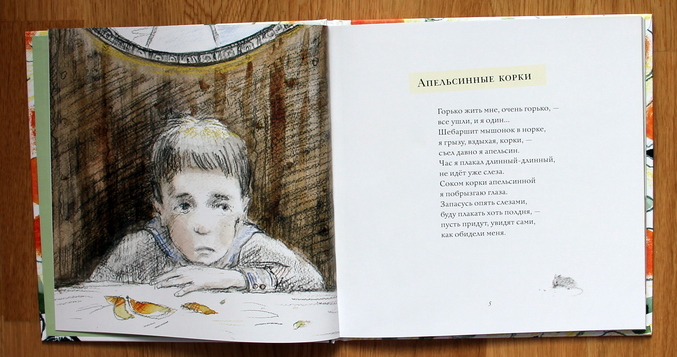 Что же касается содержания, "Апельсинные корки", мне кажется, интересно будет читать примерно от дошкольников, но скорее - младшим школьникам - младшим подросткам. Здесь - тоже нечастое явление в детской поэзии - много внимания уделено чувствам грусти, обиды, горечи. Для них для всех есть название, и у маленького читателя будет и радость узнавания, и принятие (я не один такой), и одновременно - очевидная удача Моравской, очень подкреплённая иллюстрациями Андрея Дубровского - уюта и тепла: иногда можно и поплакать, и пообижаться, и помечтать о том, как бы сбежать из дома, но "а как же я буду в апреле без базаров на вербной неделе? Жалко также и новых коньков: там, пожалуй, не будет катков... Жалко маму, котёнка и братца... Нет, уж лучше остаться..."