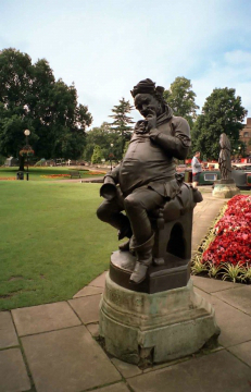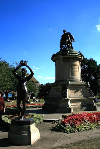 Памятник Шекспиру в его родном городе Стратфорде-на-Эйвоне. На площади у набережной отлитый из бронзы гений пера восседает в центре, а по равноудаленным углам - расположились герои его творений. Леди Макбет, Гамлет - принц датский, весельчак Фальстаф плотным кольцом окружают своего создателя.