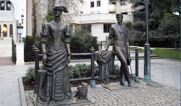 Начитанные прохожие каким-то образом узнают в мужской фигуре и Дмитрия Сергеевича Гурова, а в «даме с собачкой» открывают черты актрисы МХТ Ольги Книппер.