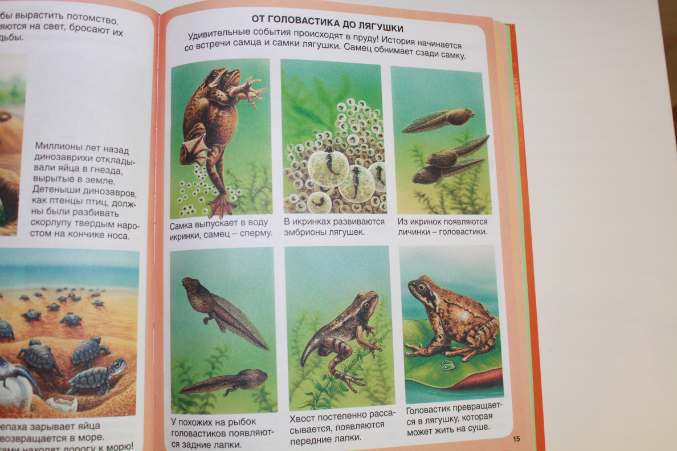 В книге описывается достаточно подробно цикл жизни растения, животного, птиц, лягушки. На фото ниже видно, как нарисован этот процесс. Про лягушку (и подобным им) достаточно подробно описан сам процесс... спаривания, что кем и куда выпускается))).