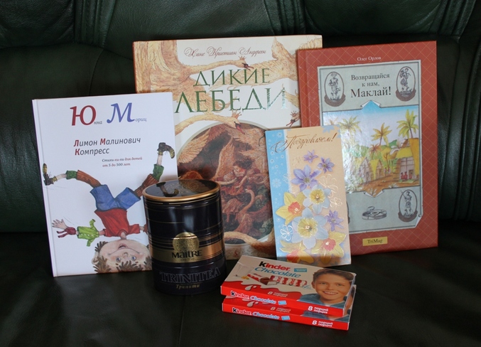 Оля подарила нам целых 3 чудесных книги (я уже прочитала Юнну Мориц с огромным удовольствием:)), вкусные Киндеры детям и чай нам с мужем, и весеннюю открыточку. еще раз спасибо!