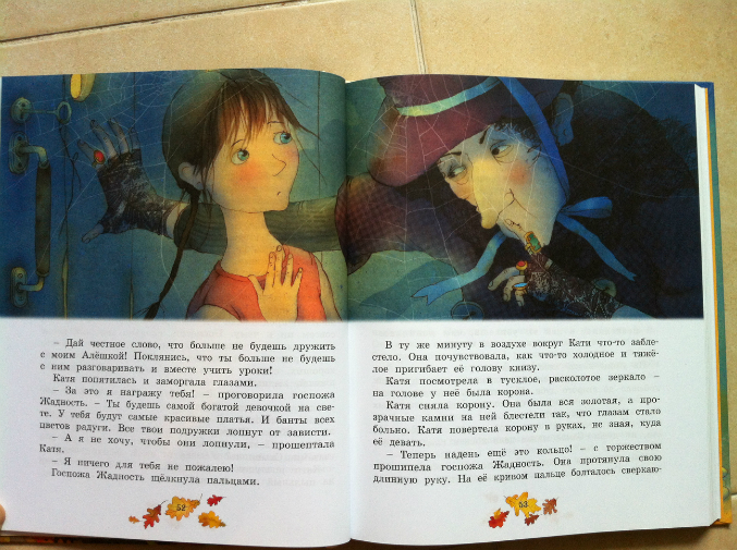 "Жила-была на свете госпожа Жадность. Ну да, самая обыкновенная Жадность. И жилось ей очень плохо. На её беду люди все ей попадались добрые и щедрые. Они делились друг с другом всем, что у них было. Если было холодно, то они делились одеждой. Если было голодно, то они делились хлебом. А если было весело, то они делились радостью."