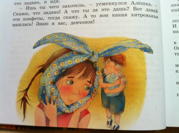 Дальше очень важный вопрос встречи ребенка с незнакомым "добрым" взрослым! Не хватало Алёшке сладких конфет, мама только две выдавала в день(((( а госпожа Жадность - целую коробку! И новый велосипед! И деньги! Дрогнул мальчик, не устоял перед подарками и льстивыми словами, стал злым и жадным, даже бабушке валерьянки за деньги накапал. И только при встрече с девочкой Катей возвращались к нему и добрые мысли, и колдовство отступало. Кай и Герда, но попроще и покороче.