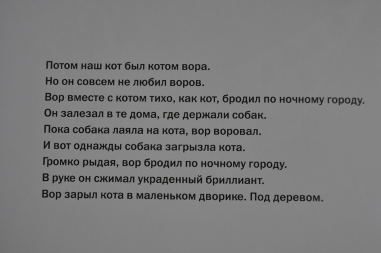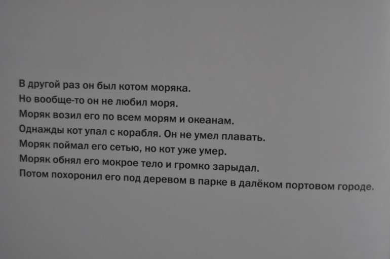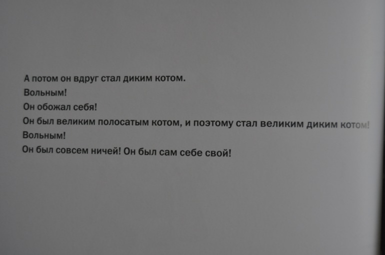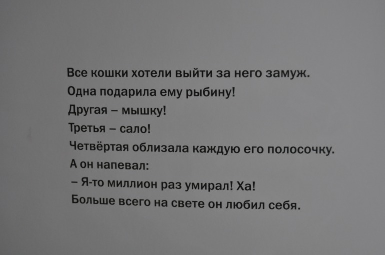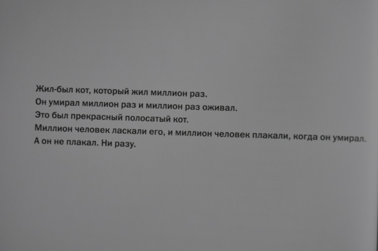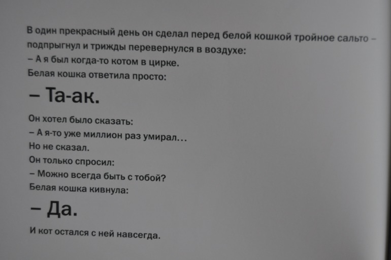 "Большего всего на свете он любил себя." Опять самообман. Но тут появилась белая кошка. Ей было всё равно, что он "уже миллион раз умирал" и чему его научили в цирке. Она просто сказала "ДА", когда кот спросил: "Можно всегда быть с тобой?" Она приняла его такого, каков есть, не требовала от него чего-то, как король, моряк, циркач, вор и другие.