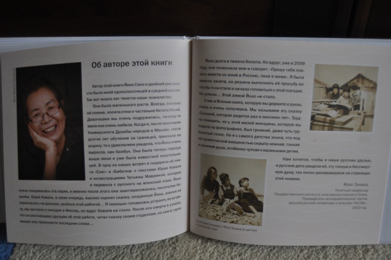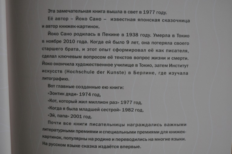 Хочу обратить ваше внимание, что перевод Юрия Коваля! В конце книге размещены две интересные статьи про автора и переводчика. История у этой сказки самая сказочная! После того, как подруга Йоко подарила ей книги Коваля "Снег" и "Бабочка"с иллюстрациями Мавриной, она увлеклась его творчеством. В свою очередь, Ковалю понравилась сказка Йоко, и он решил перевести ее на русский язык. К сожалению, встрече этих двух замечательных писателей не удалось состояться. Коваля не стало. А потом после болезни умерла и Йоко, так и не съездив в Россию. А сказка про кота вышла в свет и очень популярна в Японии! Оказывается, Коваль читал ее своим студентам, но ком в горле мешал ему произнести последние слова...