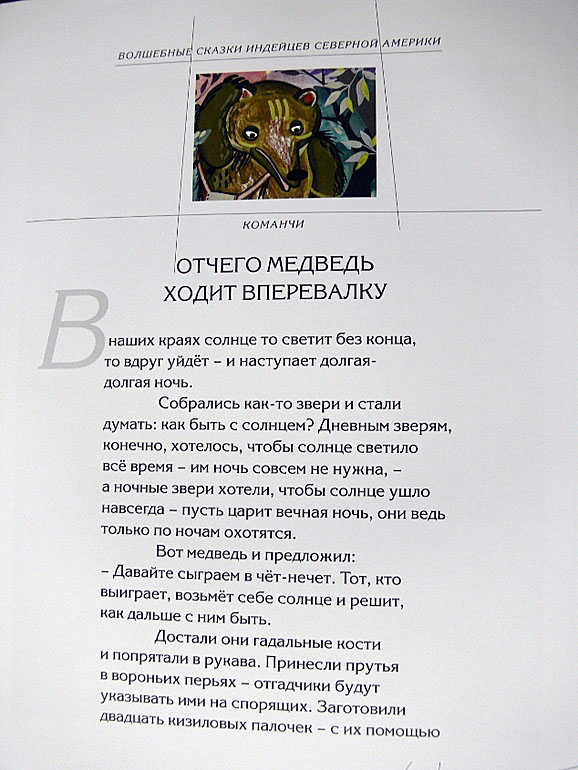 Увидела в анонсе несколько страниц, купила сразу, как только книга вышла, не дожидаясь отзывов. Хочу показать именно иллюстрации (все цветные). Для общего представления о содержании самих сказок фотографии первых двух сказок выкладываю подряд ,сохраняя очередность текста и иллюстраций к ним. Читать начали вчера и прочли только несколько сказок. Поэтому делюсь первым субъективным впечатлением. Текст легко читается и не перегружен сложными оборотами, в то же время с элементами индейского колорита. Читатели, ищущие глубокий философский смысл вряд ли будут удовлетворены.