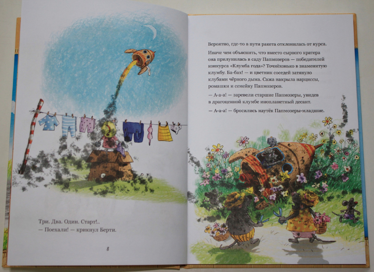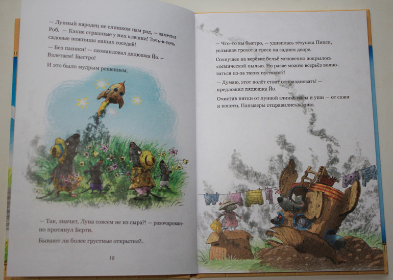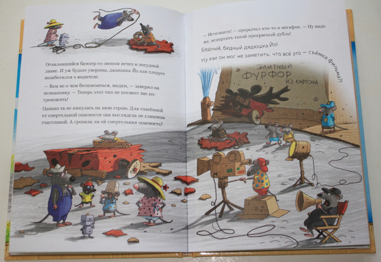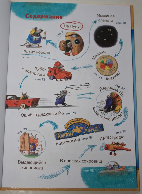 Сама книжечка представляет собой 11 историй-зарисовочек из жизни мышиной семьи, живущей в картонном городке Папенбург. Истории совсем небольшие, незатейливые, достаточно веселые и озорные. На какой возраст рассчитаны затрудняюсь сказать, есть рассказики, понятные и 3-х леткам, основная масса - лет с 5-ти.