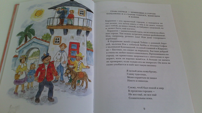 А теперь о самой обаятельной книге: В городке Кардамон всем живётся так, что любо-дорого! Но не в каждом городке можно встретить говорящего верблюда и самого доброго полицмейстера. А ещё там можно прокатиться на двухэтажном трамвае, без билета! И петь песни везде и всем, даже собакам! Правда, иногда в Кардамон наведываются разбойники, но от этого жизнь становиться только веселее и интереснее! Какому мастеру своего дела понравиться, что с частой периодичностью похищают его товар будь то мясо, хлеб или молоко?! И люди стали требовать полицмейстера арестовать разбойников. А как это можно сделать, ведь у них в доме живёт всамделешный, настоящий лев!
