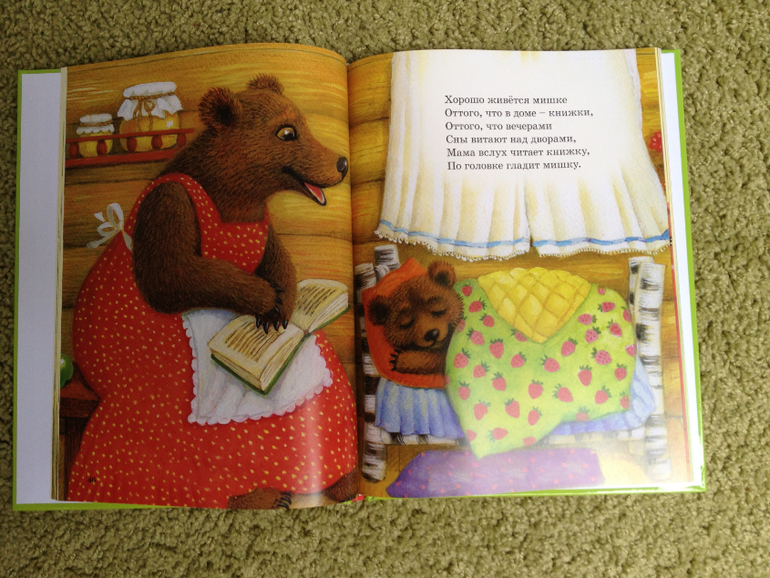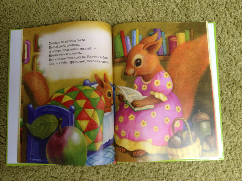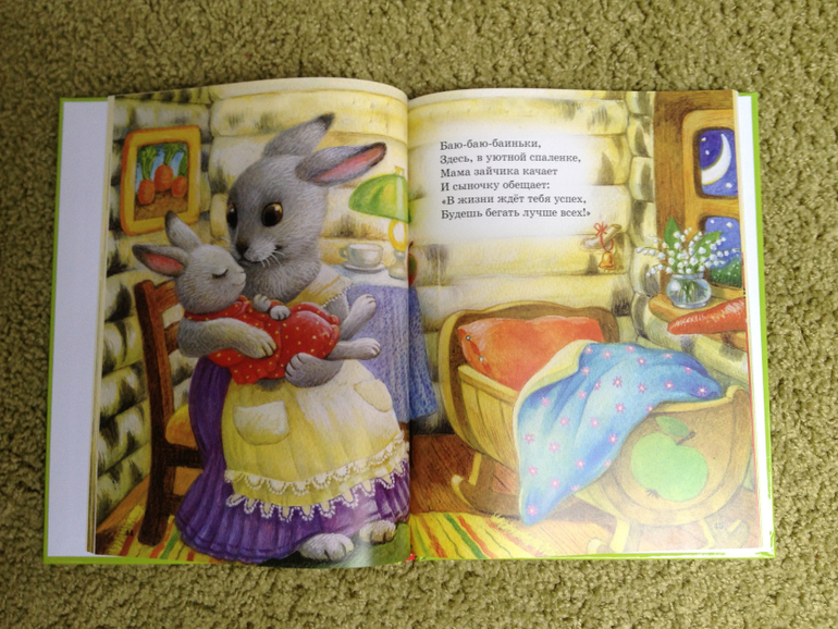 В книге собраны стихи разных авторов, проиллюстрированных разными художниками. Я ее купила ради "Колыбельных" Ольги Александровой с иллюстрациями Ксении Павловой. Потому что сын, увидев фото страниц книги у меня на мониторе, потребовал ее ему почитать:)