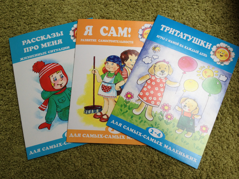 Первые две - коротенькие истории-ситуации, типичные для жизни малыша. Моему сыну пока очень понравилась первая. Третья книжка - игры-минутки. Это шпаргалки для мамы.