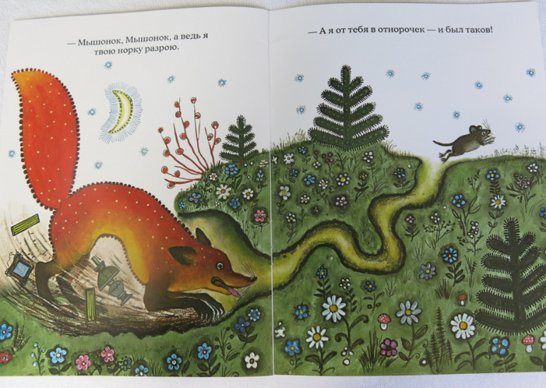 "Лис и мышонок". Сказка В.Бианки. Все ее знают! В отличие от предыдущих имеет очень плотные листы и обложку. Здесь мне иллюстрации Васнецова нравятся, а вообще я не поклонница. Диалог понятный даже в нашем возрасте: хищник хочет поймать мышку, но не так то все просто). Наша фишка это в конце разрыть норку и показать пальчиком по картинке как мышонок убегал.
